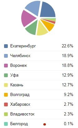 Итак, для начала благодарю всех, кто просмотрел пост о романе "Вторжение в Китай" из серии "Небесный король" - а это были 1667 человек из разных городов #России. Больше всего было читателей из #Екатеринбурга, #Челябинска, #Воронежа, #Уфы и #Казани. Конечно, были читатели из других городов. Любители деталей - смотрите на диаграмму под постом.