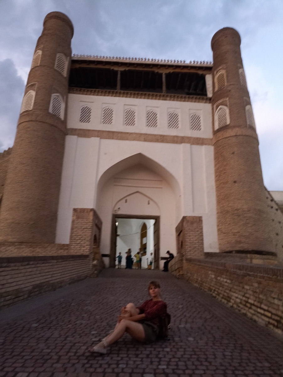 2. Цитадель Арк. Тоже обязательно к посещению. Самое древнее сооружение Бухары. Цитадель Арк была настолько продумана от врагов, что даже большевикам не удалось ее взять с первого раза. Ее бомбардировали в несколько заходов и из-за этого она была сильно повреждена. Люди, кстати в то время были настолько далеки от цивилизации, что думали самолеты это проделки демона или Божья кара. К слову сейчас ее восстанавливают и что в наше время- это восстановленное здание, но если обойти сзади , вы увидите старые стены, которые со временем разрушаются. Внутри крепости продают сувениры, птички поющие водой, не дорогой и в тоже время интересный сувенир. Купила своим детям по одной, верблюдов набивных, колпак на чайник, опахало и многое другое. Часть крепости закрыта, но приёмный зал и некоторые покои правителей открыты. Последний Эмир, кстати во время бомбежки по подземному ходу убежал в Афганистан, как говорят многие экскурсоводы этого города. И Бухара раньше была вовсе не Узбекистаном, а Таджикистаном. За одну ночь таджики по волшебной по маху волшебной палочки большевиков превратились в узбеков. Недалеко от арка находится тюрьма, так же обязательно ее посетите, вы увидите, в каких условиях жили узники.