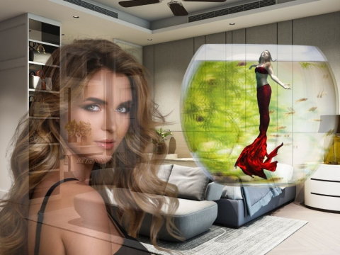 Возле неё, висящей в воздухе, повис тоже в воздухе огромный аквариум, наполненный водой. И в нём плавали рыбки.