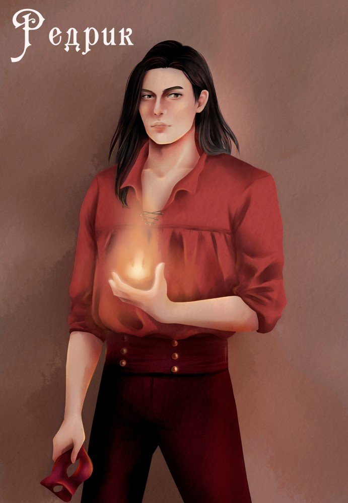 "Он тоже в красном был. Алая рубаха по телу его словно огонь жидкий перетекала. Штаны из плотной ткани на бедрах так туго сидели, что каждое движение было видно. На плечи алый плащ накинут, хотя с волосами хозяину вулкана и делать ничего не пришлось. Если парни в селении на Ночь Костров волосы порошком шафрановым присыпали, то в волосах Редрика алые пряди так и сияли. Зато и не отличишь теперь его от люда на празднике.