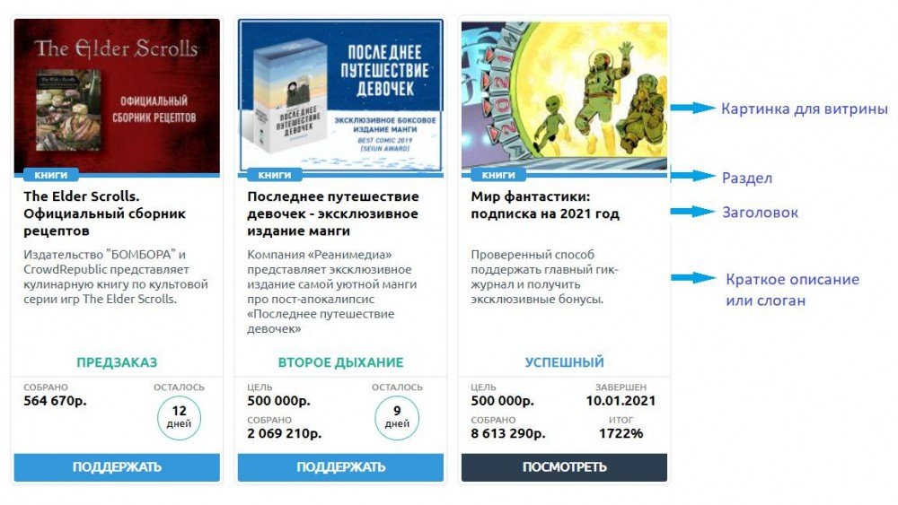 Картинка для витрины — обложка проекта, которую аудитория увидит в галерее предпросмотра на сайте. Например, обложка книги и слоган.