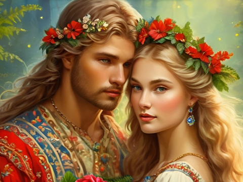 Еще утром возле колодца стояла девушка по имени Лада, бережно переплетая стебли 12 заветных цветов праздника Купалы в изящный венок. Её длинные золотистые косы свободно струились вдоль спины, оттеняя тонкую талию и мягкость черт лица. Люди часто обращались к ней за советом, ибо владела она особым даром — видела сквозь завесу будущего, предсказывая события, скрытые от глаз простых смертных.
