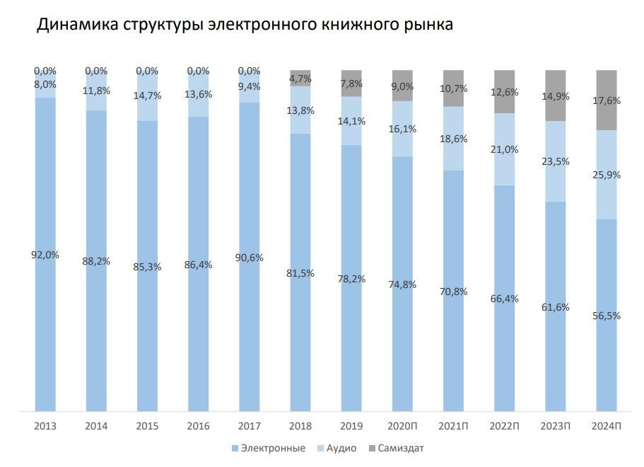 К 2021 г. доля э-книг может превысить 15%, а в 2024 году объем рынка цифровых книг превысит 20 млрд рублей (25–35% от общего объема рынка).