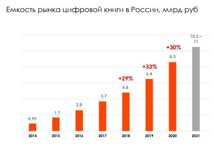 2020 год был успешным для развития цифровой книги в России. Объём сегмента составил 8,5 млрд рублей, или около 10% от всего книжного рынка.