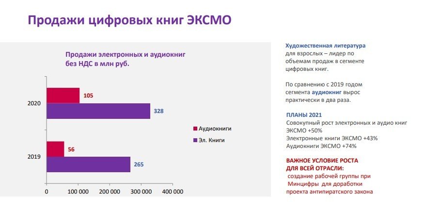 Лидером по продажам цифровых книг в «ЭКСМО-АСТ» является художественная литература. При этом продажи аудиоизданий в 2020 г. уже превысили 250 млн рублей, рост составил 75%.