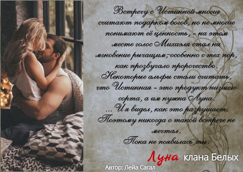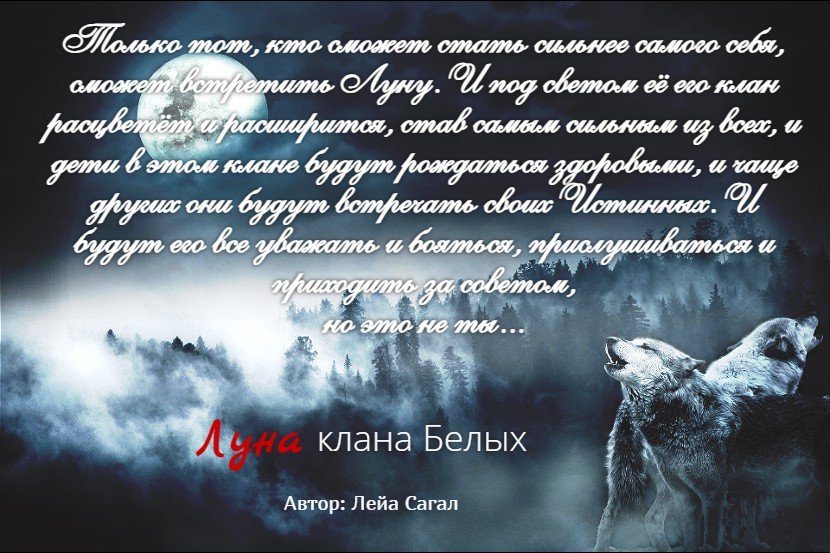 Есть пророчество, в котором говорится о том, что тот альфа, который найдет Луну, обеспечит своему клану процветание. Будут рождаться здоровые дети, чаще встречаться Истинные, сами обитатели клана станут здоровее и сильнее. Для многих это стало целью, но над благосостоянием своего клана я работал сам и не надеялся на других. Поэтому мне были неинтересны эти игры.