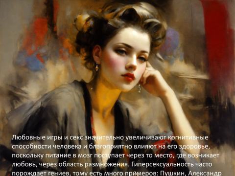 Любовные игры и секс значительно увеличивают когнитивные способности человека и благоприятно влияют на его здоровье, поскольку питание в мозг поступает через то место, где возникает любовь, через область размножения. Другими словами гиперсексуальность часто порождает гениев, тому есть много примеров: Пушкин, Александр Дюма, Гете, Шекспир, Эйнштейн, Пикассо, Чарли Чаплин.