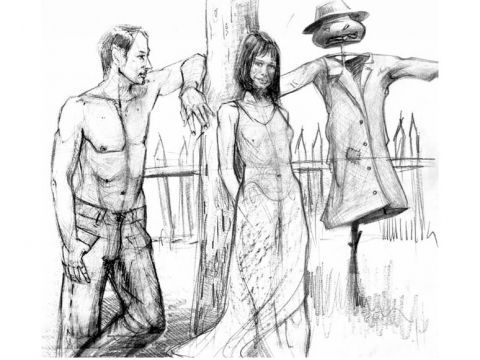 На ФОТО: Один из эскизов обложки «Пугала» Алексея Алпатова. Арт-директор Марина высказала пожелание изобразить обнаженный торс, который в те годы только входил в моду (сейчас он в некоторых издательствах запрещен). Подписывайтесь на роман по ЭТОЙ ССЫЛКЕ