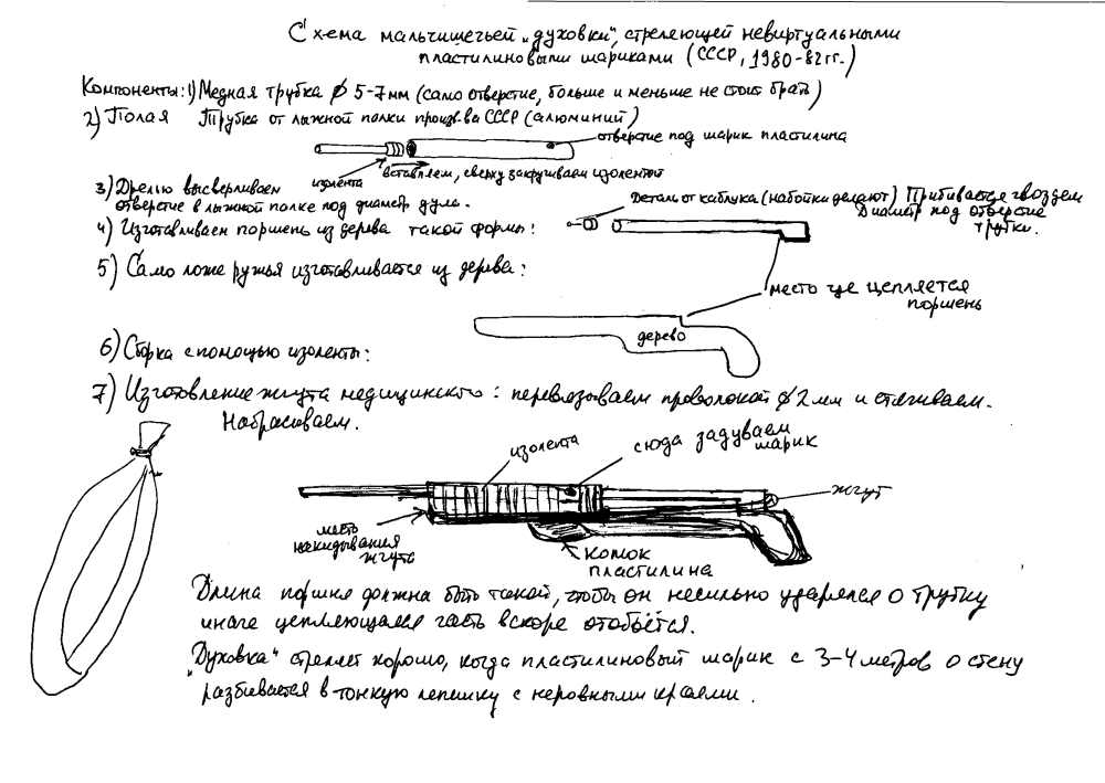 Нашими играми становилось всё, что попадало в круг интересов. Если война, то мы мастерили ружья, сначала стреляющими пульками из алюминиевой проволоки, нужно было придумать спусковой механизм, найти достаточно жесткую и гибкую проволоку, согнуть её правильно, выпилить из дерева само ложе ружья, желобок нужно было сделать... Потом эта игра надоедала и мы принимались мастерить другие ружья, стреляющие из пластилина. Я делал это лучше всех, стал увеличивать калибр, мощность, словом экспериментировать. Друзья просили им сделать ружья и я делал - безвозмездно конечно. В обмен я получал восхищение и уважение. Не все измеряется деньгами, да и таких мыслей тогда у нас не было, не было социальных сетей, где такие мысли могли транслировать через посты определенного толка.