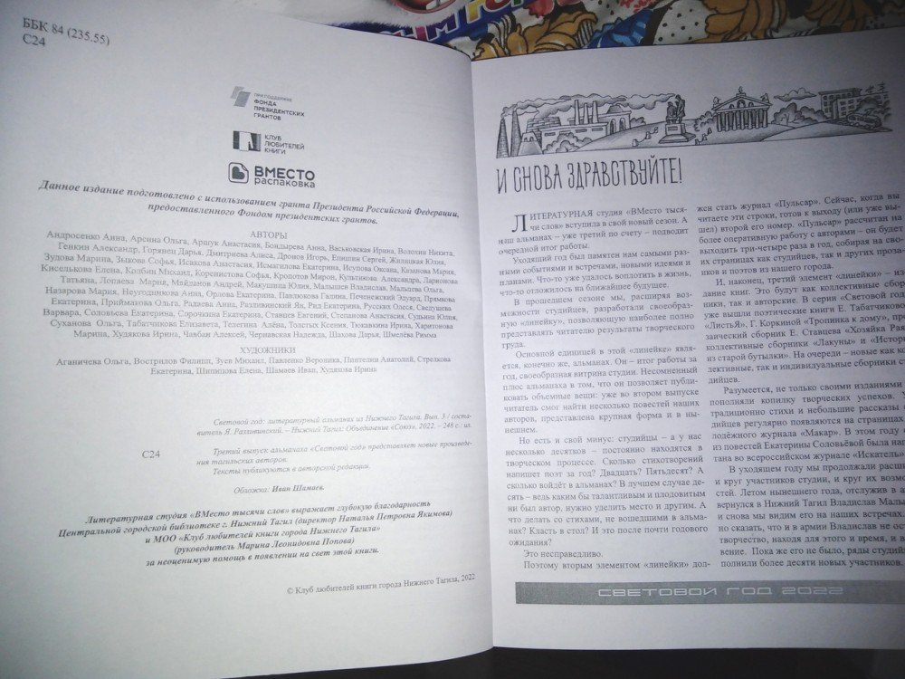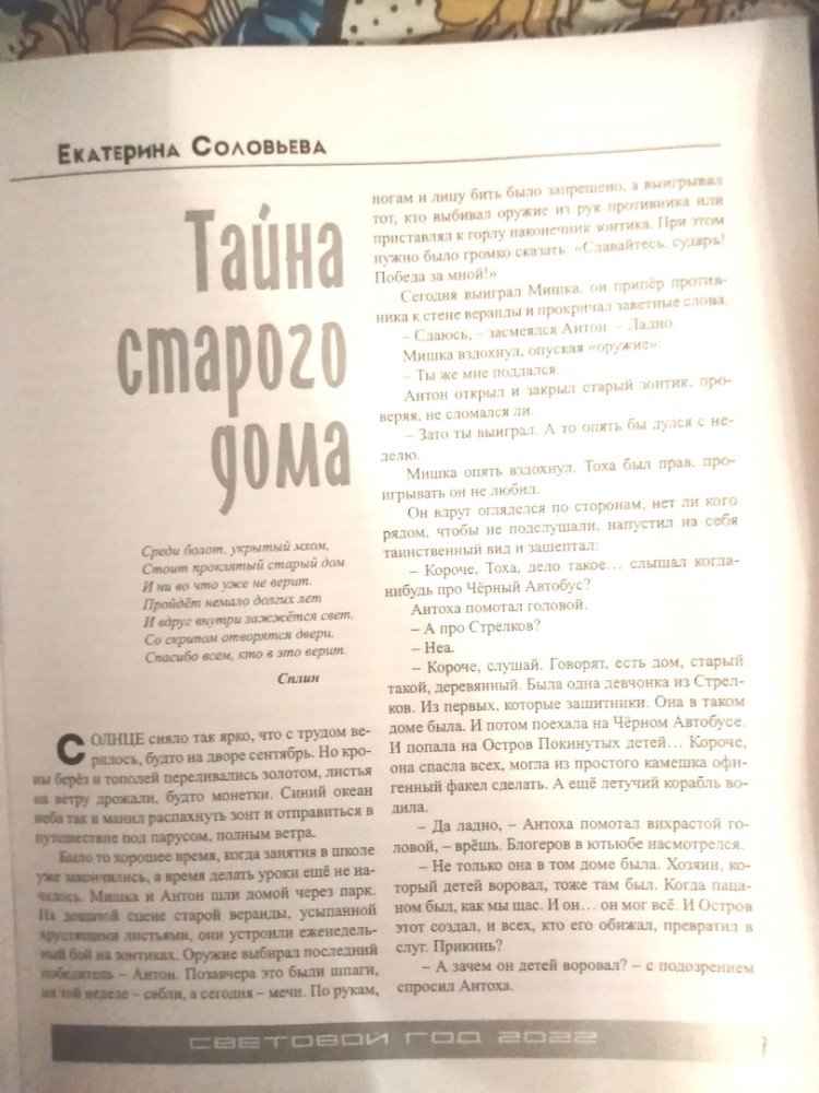 Вот она, моя новая публикация! Этот год у меня самый урожайный на публикации, и эта публикация – шестая. Наконец-то дошли руки сфоткать мой новогодний подарок – литературный альманах «Световой год-3» под редакцией писателя Якова Разливинского! В него вошла моя повесть «Тайна старого дома» – заключительная часть трилогии «Тайны волшебных вещей», рассказ-домашка «Я дома», рассказ «Бей!» и стихи, написанные разными размерами: ямб, хорей, амфибрахий, дактиль, анапест. Работы пока пробежала только глазами, но видно, что они очень интересные. Положа руку на сердце, очень хочется сесть с альманахом в уютное кресло и читать, читать, читать...