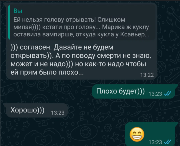 Андрей – режиссер – прикрепил к проекту свои наброски, завязку сюжета. Все остальное ложилось на сценариста. Можно и нужно было нести свои идеи. Я дала ссылки на мои книги, просто как референс. Но, поскольку действие фильма планировалось в настоящем времени и в современных декорациях, а у меня по хронологии немного не то (XV век – начало XX – начало XXII), то моя история во временные рамки не лезла. Однако сами книги заинтересовали режиссера, и он взял меня на этот проект.