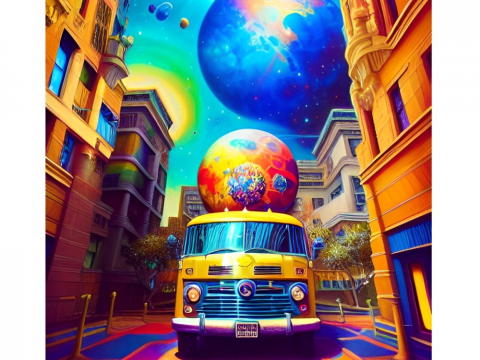 Обратилась к нейросети... Не знала с чего начать, и задала ей всего два параметра: желтый фургон и космос. Оказалось, что она лучше знает, что мне надо))) Именно из желтого фургона раздавали ампулы "счастья", из-за которых люди могли создавать свои миры одним лишь своим желанием! Картинки получились с философским смыслом и именно с тем, с которым надо! Нейросеть предложила мне еще варианты с человеком возле фургона, но на всех картинках этот "человек" более походил на инопланетянина))) Хотя и тут сетка не ошиблась, я не взяла эти картинки. Зачем же мне спойлеры на обложке!)))