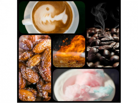 Зерна кофе и миндаль, пока они еще горячи, всыпать на дно чашки с готовым кофе. Добавить сливок, не перемешивать! Пучок ваты уложить сверху вместо густой пенки. Вату сбрызнуть горьким жженым сахаром.