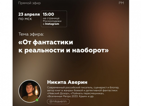 23 апреля в 15:00 (мск) в Instagram Росмолодежи (https://www.instagram.com/rosmolodez/) состоится прямой эфир с современным российским писателем, сценаристом и блогером, автором книг в жанрах боевой и детективной фантастики «Невский Дозор», «Поймать пересмешника», «Вселенная Метро 2033. Крым», одним из основателей портала «Литмаркет» Никитой Авериным.