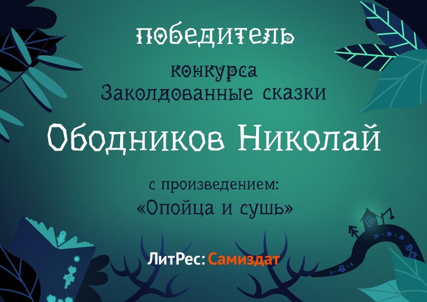 Прошло каких-то три часа (в ретроспективе), как объявили победителей конкурса «Заколдованные сказки», а я до сих пор чувствую вокруг себя тепло, словно от приема горячей ванны. Да, рассказ «Опойца и сушь» вошел в десятку победителей. Честно говоря, я сомневался в победе. Хотя бы потому, что рассказ представляет собой больше мистический реализм, нежели сказку. Тем не менее вот мы — жмем руки остальным победителям.