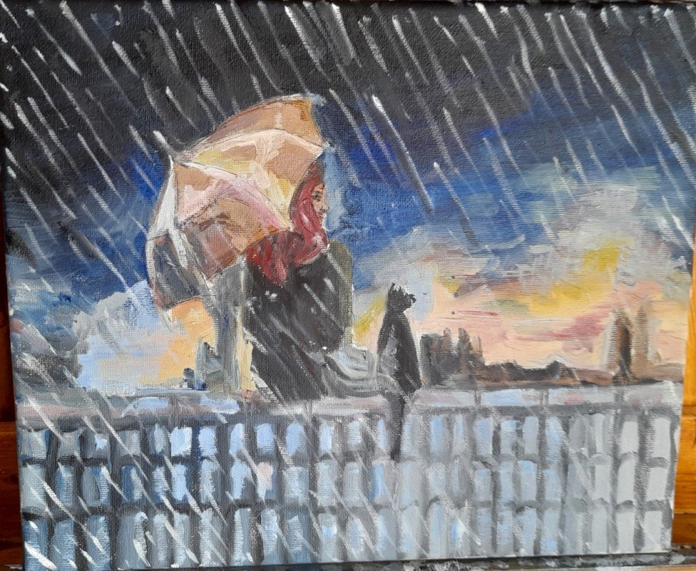 Первое место - картина "Девушка и кот под дождем" (холст, масло 30*25) + печатная книга Вернуться затемно с автографом автора.