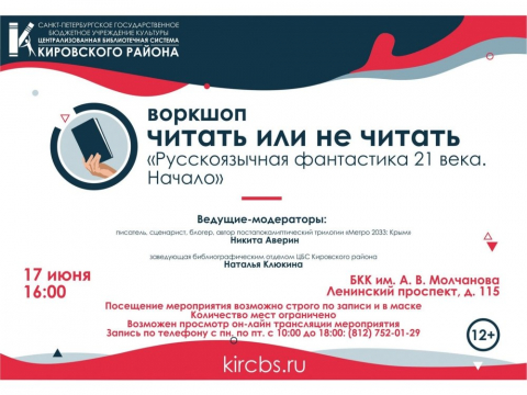 17 июня в 16:00 в Библиотечно-культурном комплексе им. А.В. Молчанова (Ленинский пр., д.115) состоится встреча проекта воркшоп «Читать или не читать» по теме «Русскоязычная фантастика 21 века. Начало». Целевая аудитория проекта – профессиональное сообщество и читатели.