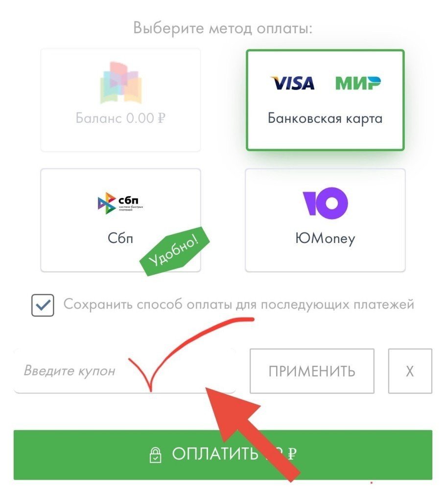 Чтобы применить купон, вам необходимо во время выбора способа оплаты вставить код в поле “введите купон” (он находится ниже под иконками методов оплаты) и нажать применить —> цена изменится с учетом скидки купона. Готово!