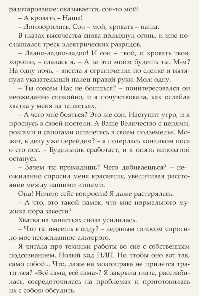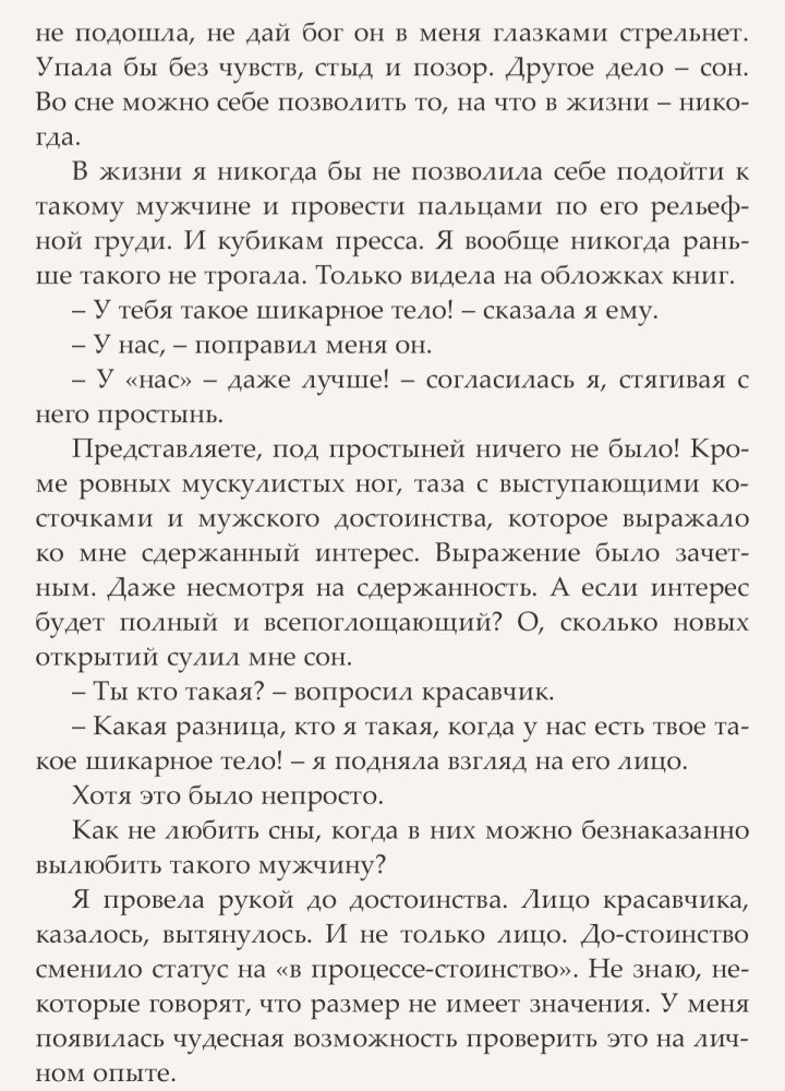 Целую неделю Сотрудница HR-отдела Алёна видит потрясающие сны. Огромную кровать, а на ней шикарную особь мужского пола. Такого красавчика она никогда в жизни не встречала. Правда, совершенства в мире нет даже во сне. Красавчик оказался самовлюбленным хамом и страдал помесью мании величия и шизофрении. Так почему бы этим не воспользоваться? Это же просто сон, хоть и эротический. Заодно и спесь сбить с этого сноба не помешало бы.