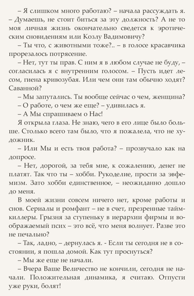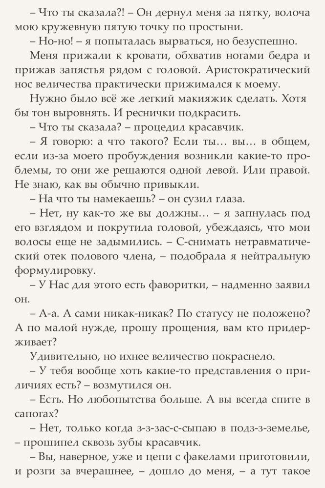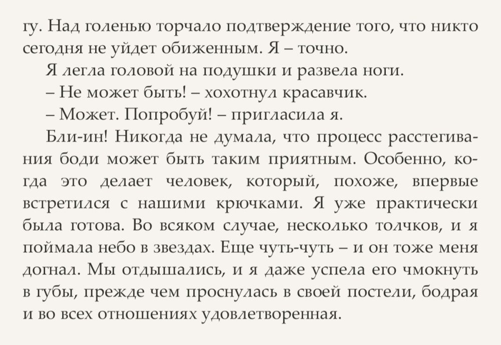 Читалось на одном дыхании, некоторые фразы хотелось утащить в копилочку афоризмов. В этой части мы с автором совпали идеально. Мне нравится юмор автора, ее диалоги и описание некоторых мест, типа «положить на к_югу_от_пупка» или описание пикника в спальне при свечах, «и романтик, и легально пожрать на ночь» (опять-таки, для нас девушек актуальненько.) В общем, язык фирменный-только Светланы, сарказм и ирония, вкупе с самоиронией , грамотная речь, богатый словарный запас и легкость изложения пикантных ситуаций.