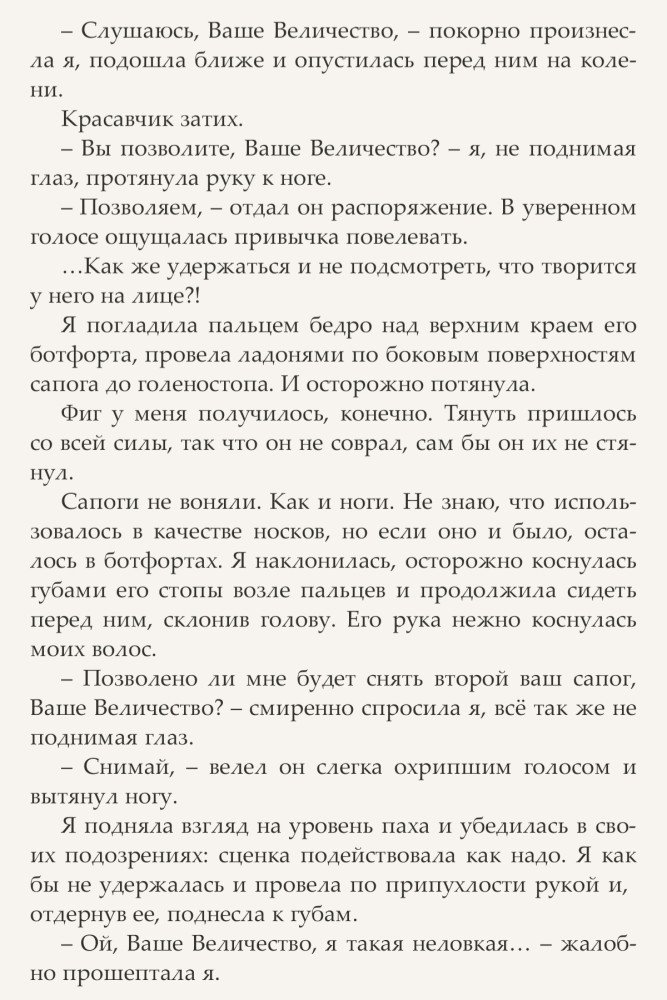 В ход пошли все наши современные методы работы с персоналом (даже тимбилдинг прошел обкатку успешно), бывшую фаворитку короля замуж выдала, непримиримых советников помирила, а оппозиционных -рассорила, нужные слухи распустила и кучу всяких нововведений ввела. Вот только не думала она, что привлечет внимание других мужчин, которые будут просит ее руки у короля. Ведь хоть он и выглядит влюбленным, но никогда сам не женится на никому не известной девице. А быть просто любовницей она наотрез отказалась. И хоть начиналось история как легкая эротика, но постепенно сюжет накаляется, интриги становяться все более изощренные, а под конец вообще трагический экшен, но с романтическим ХЭ в финале. И три эпилога, один из которых выбьет слезы, даже у самого равнодушного читателя.