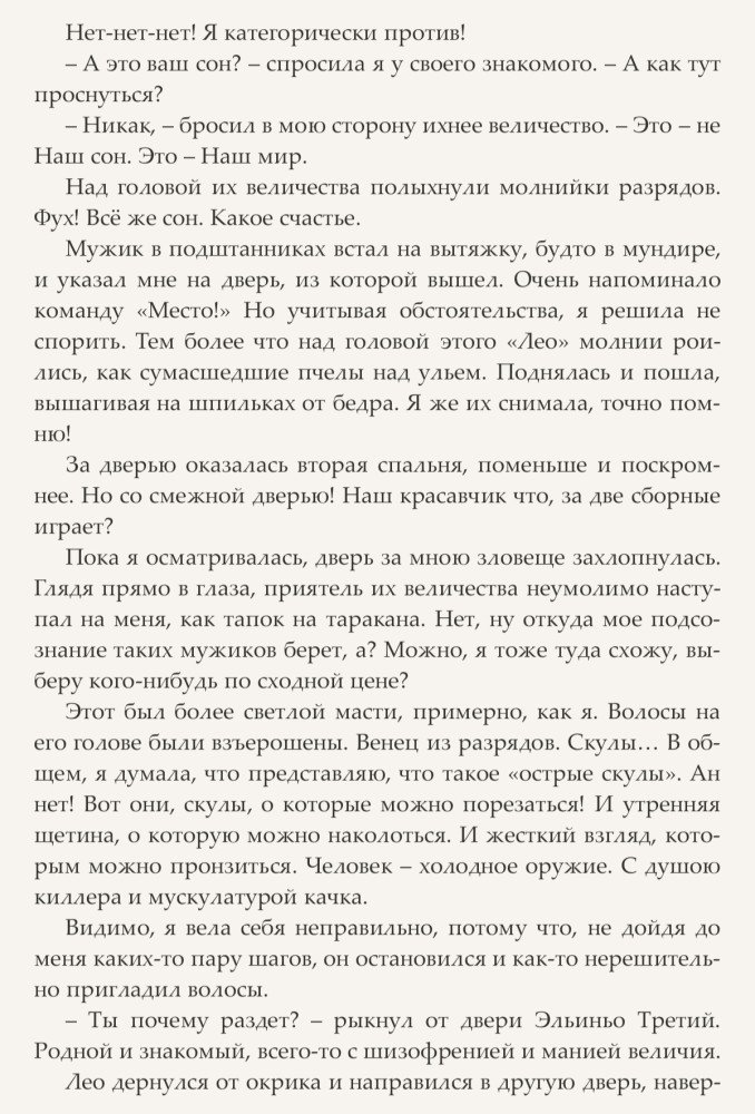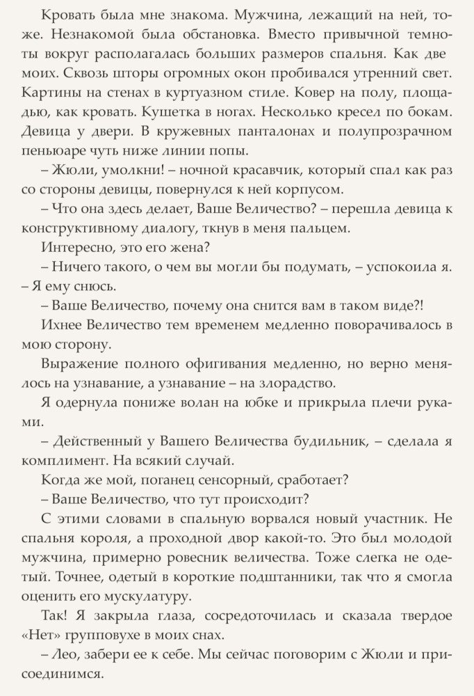 А в реальной жизни у нашей героини возникает производственный конфликт, да такой, что она подает заявление об увольнении. С горя напившись, она снова встречается во сне со своим красавчиком. Да и пожаловалась ему со слезами на глазах - как тяжело специалисту по управлению человеческими ресурсами найти хорошую работу. А он ответил, что у Них целый Двор неуправляемый и предложил работу в своем королевстве. А она возьми и в шутку согласись. И какого же было ее удивление, когда проснувшись утром от дикого женского крика, обнаружила себя в той же кровати с этой самой особью, Его Величеством Эльиньо III. Впрочем, кажется, он тоже был удивлен, обнаружив ее реальную в своей постели. И не только он.