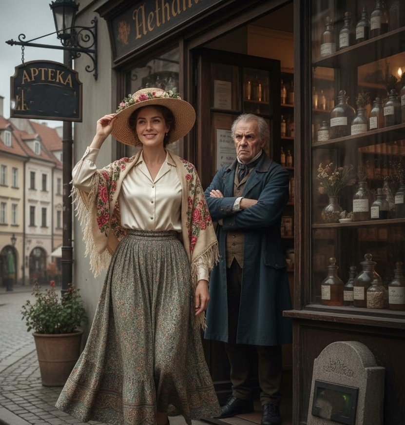 Оля поцапалась с аптекарем и торжествующая выходит вон. (из-за этой сцены книга получила плашку 18+)