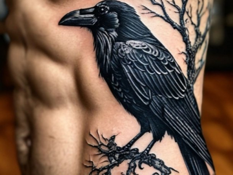 Майк снимает через голову худи, остужая на вечернем ветру тело. На косой мышце живота тату в виде ворона, смотрящего вверх. Клюв птицы направлен к пупку, в когтях она держит своё же перо.