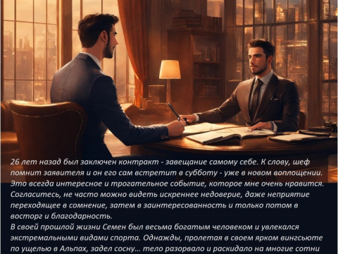 26 лет назад был заключен контракт - завещание самому себе. К слову, шеф помнит заявителя и он его сам встретит в субботу - уже в новом воплощении. Это всегда интересное и трогательное событие, которое мне очень нравится. Согласитесь, не часто можно видеть искреннее недоверие, даже неприятие переходящее в сомнение, затем в заинтересованность и только потом в восторг и благодарность.