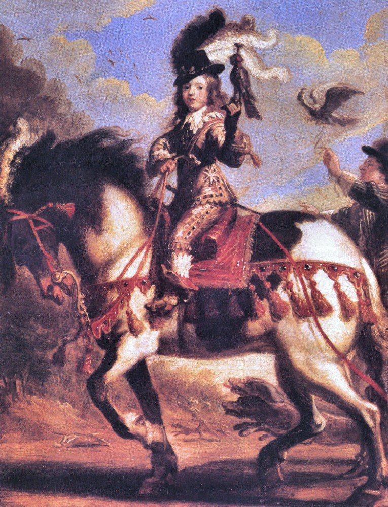 Людовик верхом на лошади во время соколиной охоты. 1647 год. Портрет Жана де Сент-Иньи.